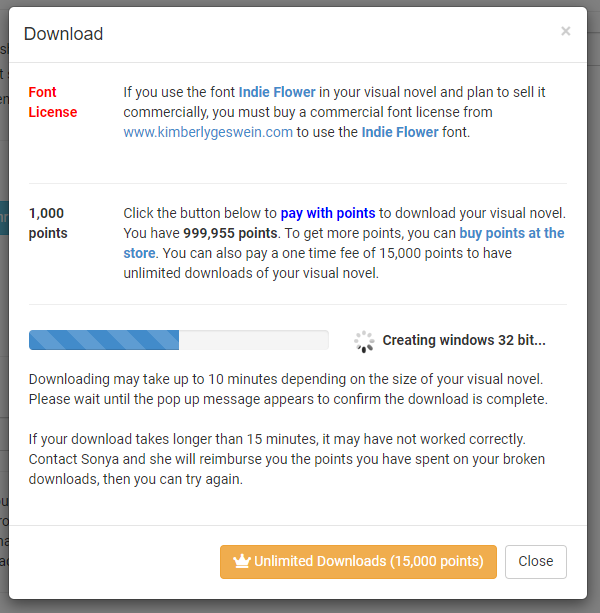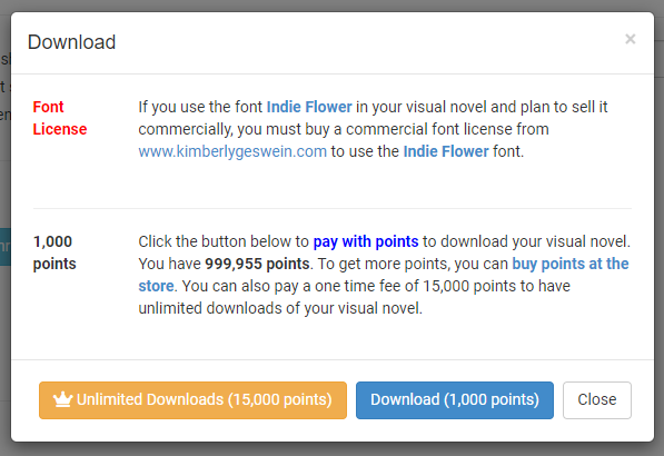 First of all, please make sure whether your project has used Indie Flower font or not. If yes, please proceed to buy the license or change it to other available fonts. Indie Flower font is licensed for free ONLY for web-use. You don’t have to buy the license if you are thinking of just publishing on CloudNovel online platform but since you are here, you must be thinking of downloading the game.